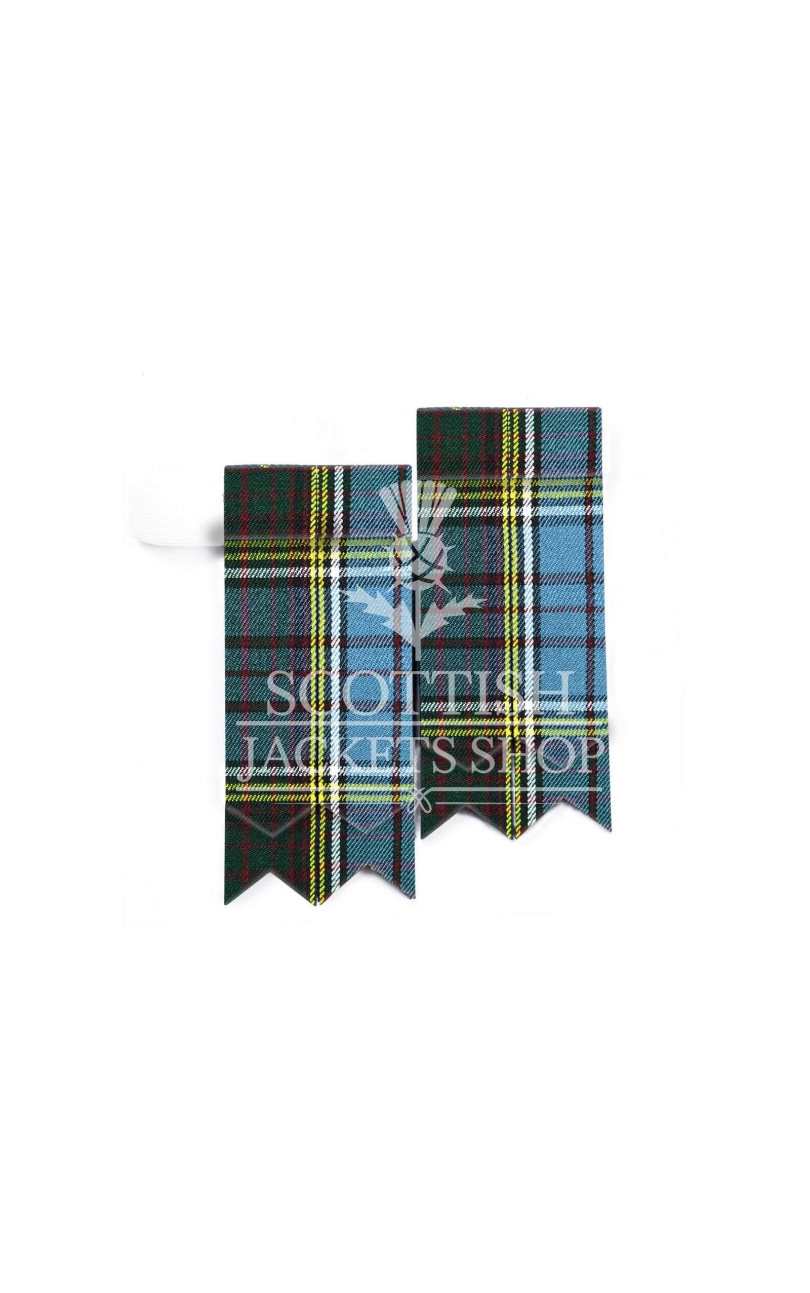 Add a touch of tradition to your Highland dress with the Anderson Tartan Flashes. These stylish and practical accessories are designed to complement your kilt hose while showcasing your Scottish pride. Featuring the distinctive Anderson tartan, the pattern includes bold blues, deep greens, and subtle red accents that pair perfectly with matching kilts and accessories.