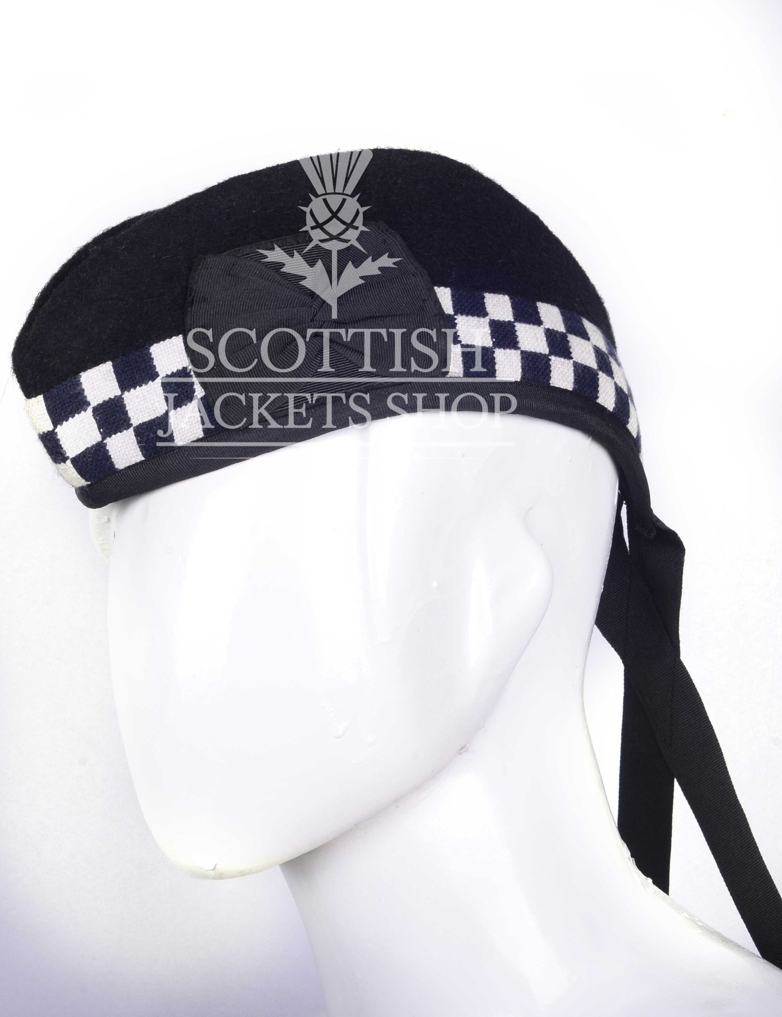 The Glengarry features the traditional shaped crown with a central crease along the top, giving it the authentic profile recognized in Scottish dress. A neatly tied black silk bow and a black ribbon tail add the finishing touches, keeping the heritage look intact.