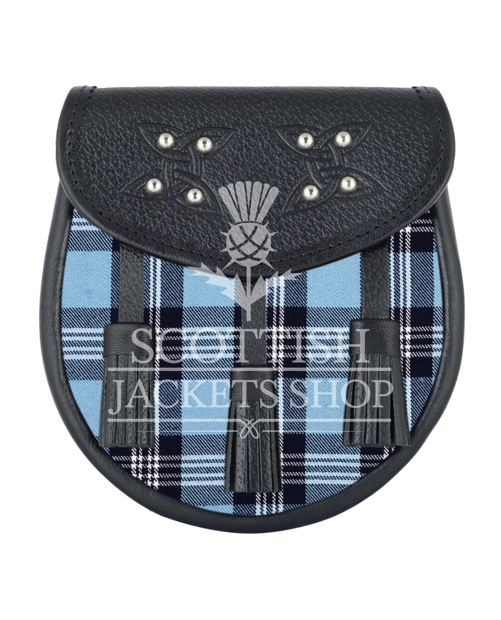 The sporran is crafted from high-quality black leather, offering both durability and refined style. The central tartan panel is framed by a smooth leather border that enhances the boldness of the pattern. Three matching leather tassels hang from polished chrome chains, delivering a timeless look rooted in Highland tradition.