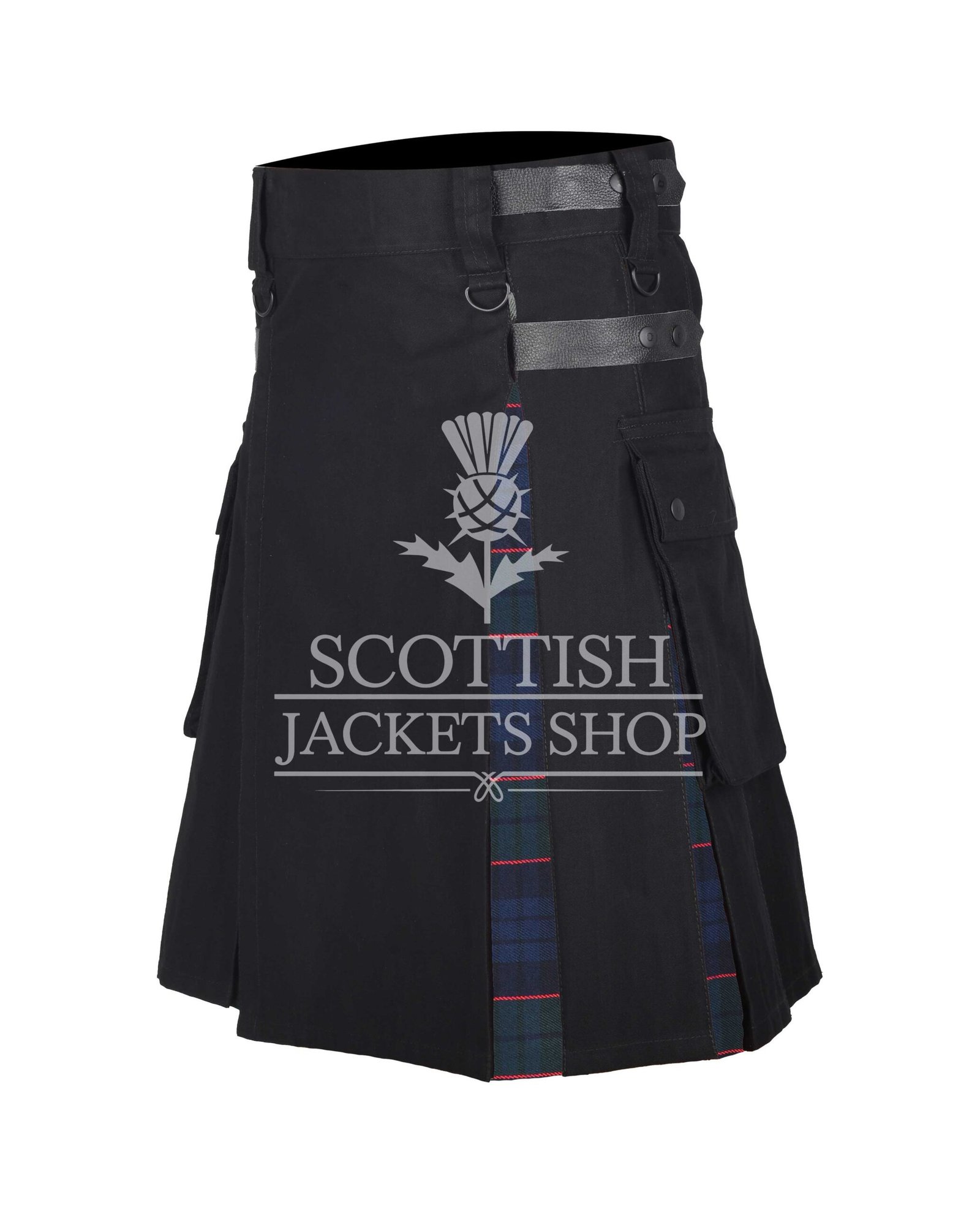 Designed for versatility, it features a durable black cotton base paired with a striking tartan front apron. Heavy-duty snaps, leather strap closures, and reinforced pleats ensure a secure and flexible fit. Spacious dual cargo pockets on each side provide room for essentials, making this kilt ideal for festivals, daily wear, or outdoor adventures.