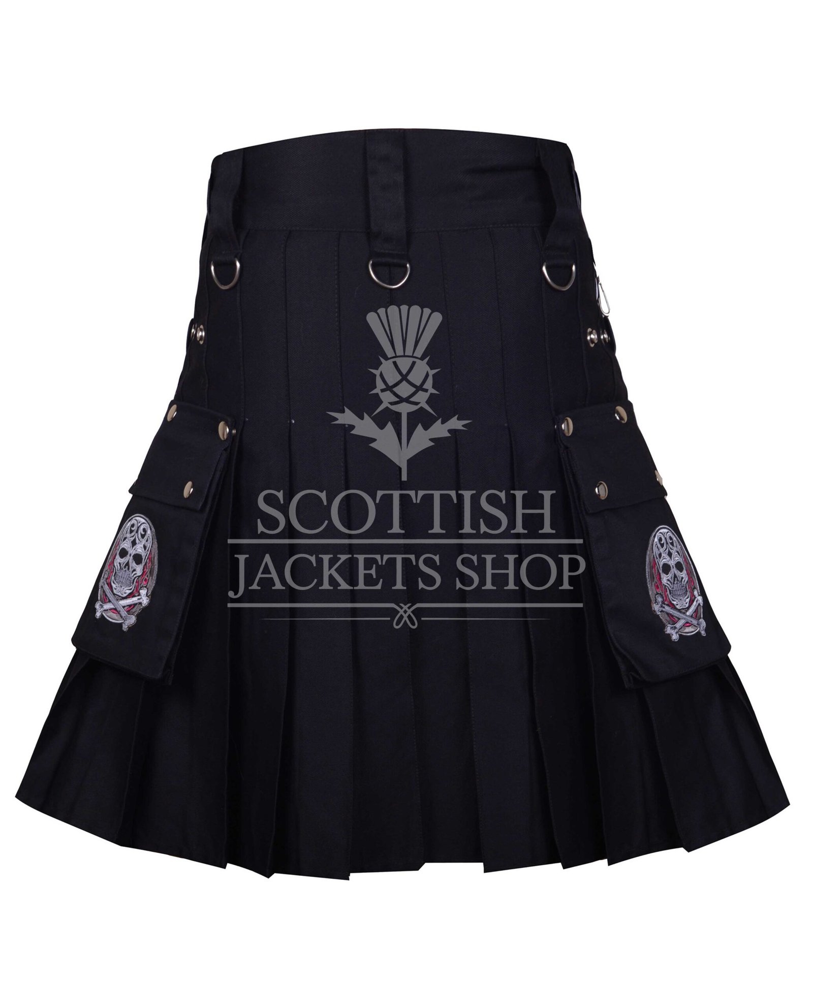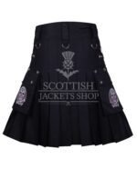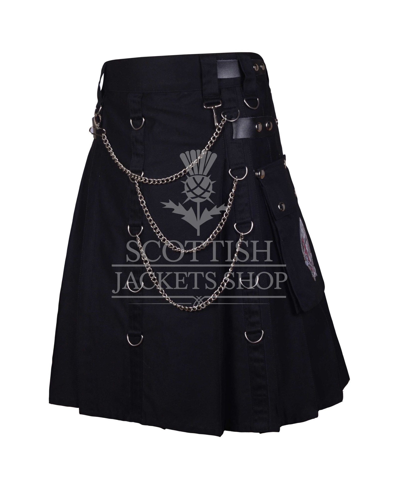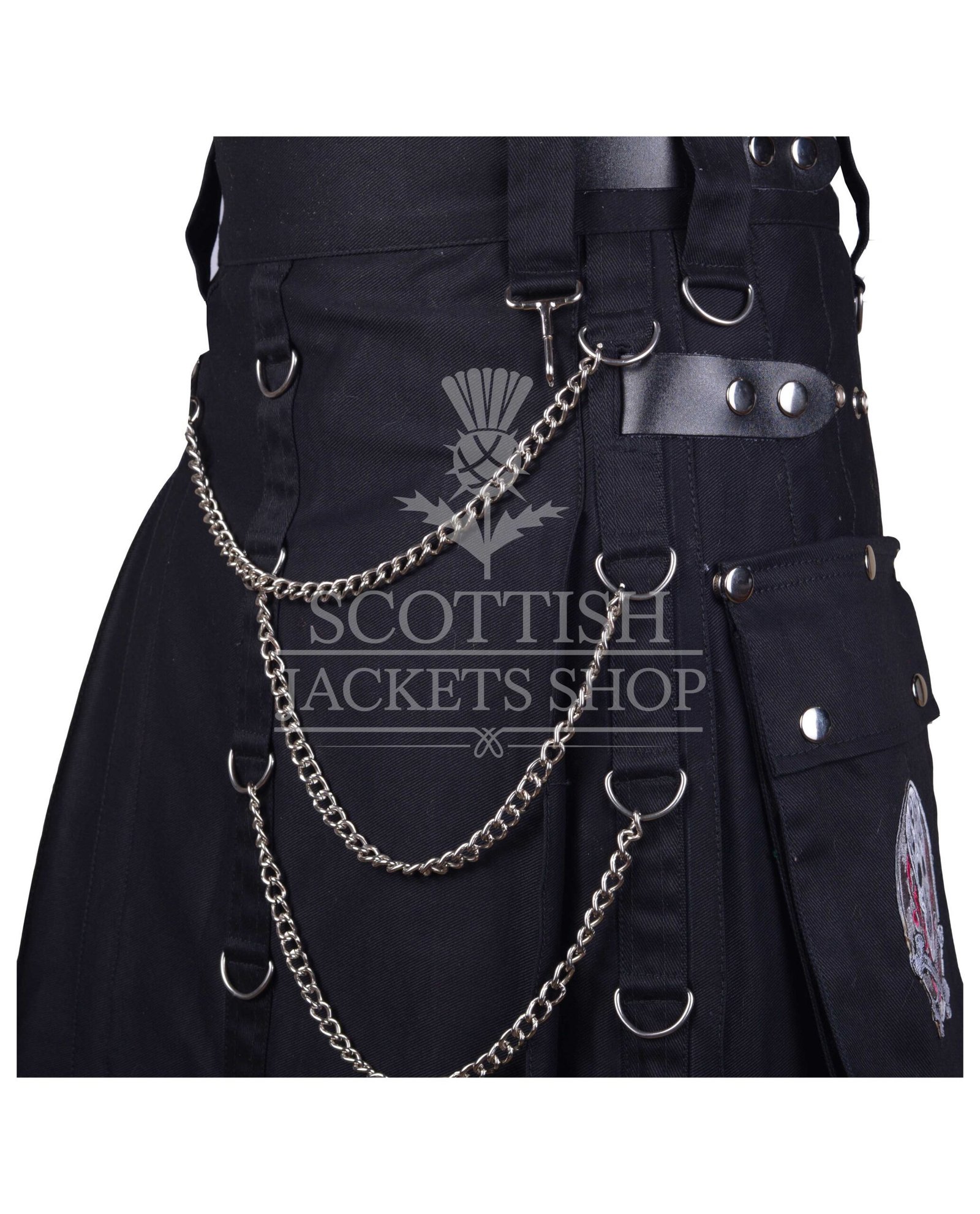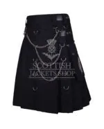 Crafted from durable heavy cotton or cotton-blend fabric, this kilt features a jet-black base (with optional dark tartan variants) that forms the perfect canvas for its aggressive detailing. From chrome chains and D-rings to metal studs, eyelets, and straps, every element screams individuality and rebellion.