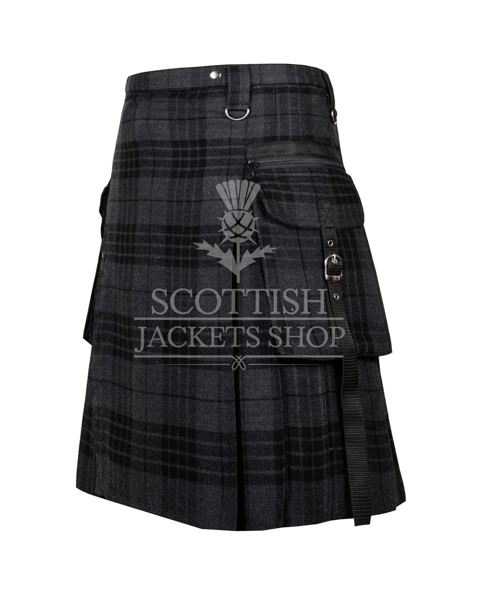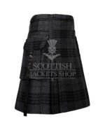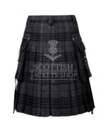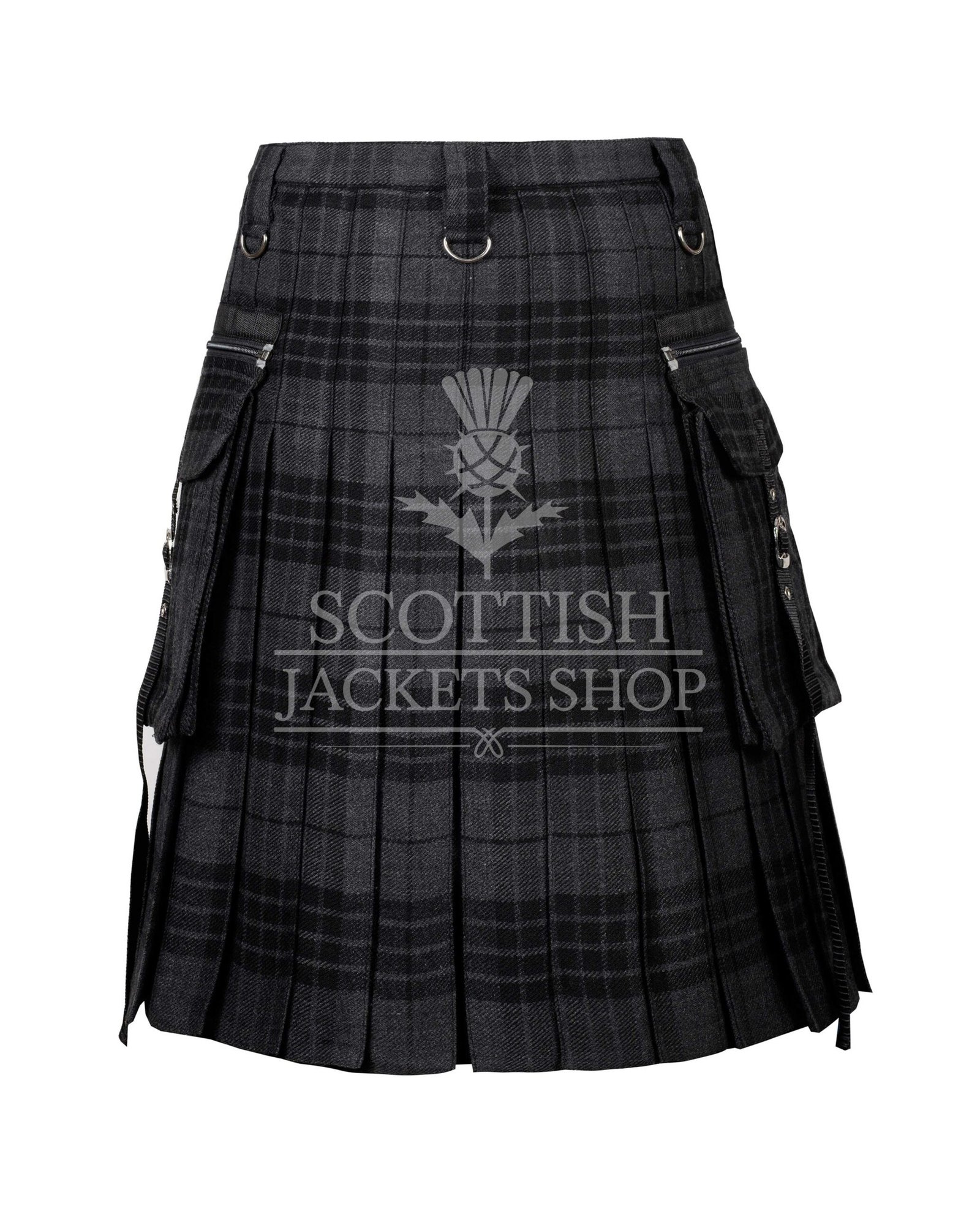 Featuring tones of steel gray, charcoal, and black, the Gray Watch tartan offers a muted yet striking look that perfectly complements gothic, punk, and metal fashion aesthetics. This isn’t your grandfather’s kilt — it’s been reimagined with metal chains, D-rings, rivets, and optional stud accents for a raw, industrial edge.