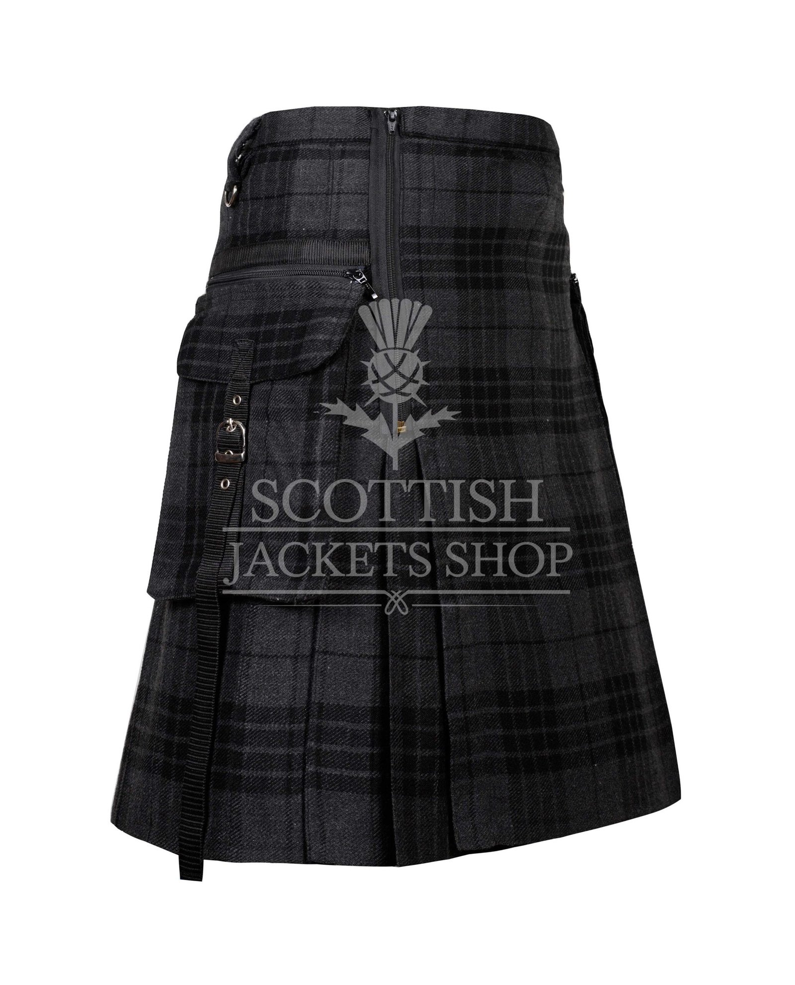 Constructed from durable acrylic or cotton-blend fabric, this kilt is lightweight yet sturdy enough for concerts, festivals, and everyday streetwear. The deep pleats at the back preserve traditional Highland structure, while the modern features bring it fully into the underground fashion scene.