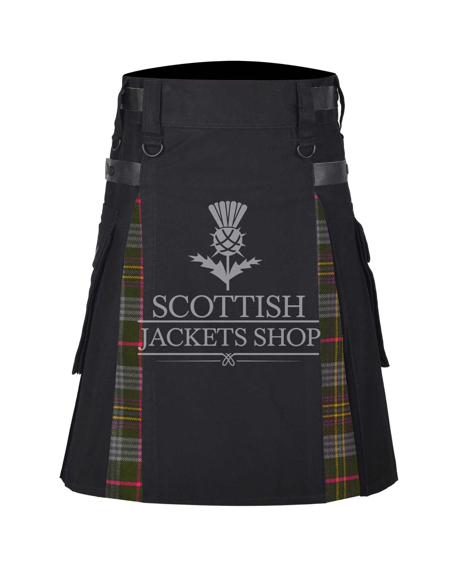Crafted with precision, the kilt features a high-quality blend of breathable cotton and durable acrylic wool. The rear pleats display the full tartan pattern in all its textured glory, while the front panel introduces a solid, utility-inspired design for a modern twist. This combination honour’s Scottish tradition while adding a tough, contemporary edge.