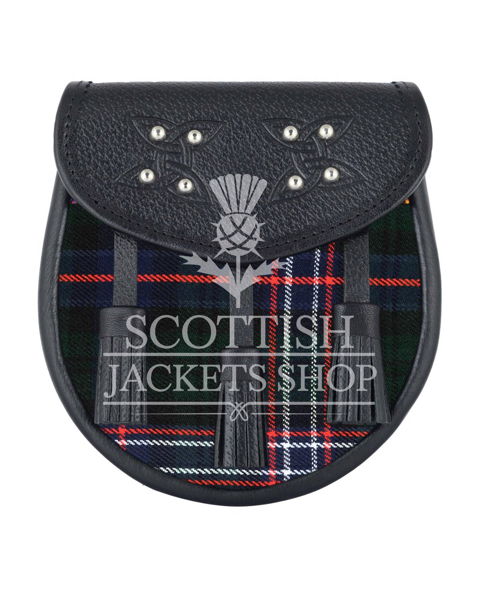 Expertly handcrafted using premium-quality leather and authentic Scottish National Tartan, this sporran offers durability without compromising on style. The front features the iconic red, green, blue, and white pattern that symbolizes unity across all Scottish clans, making it a fitting choice for anyone regardless of family lineage. A classic pewter cantle adds a touch of Celtic elegance, intricately detailed with traditional knotwork to complete the look.