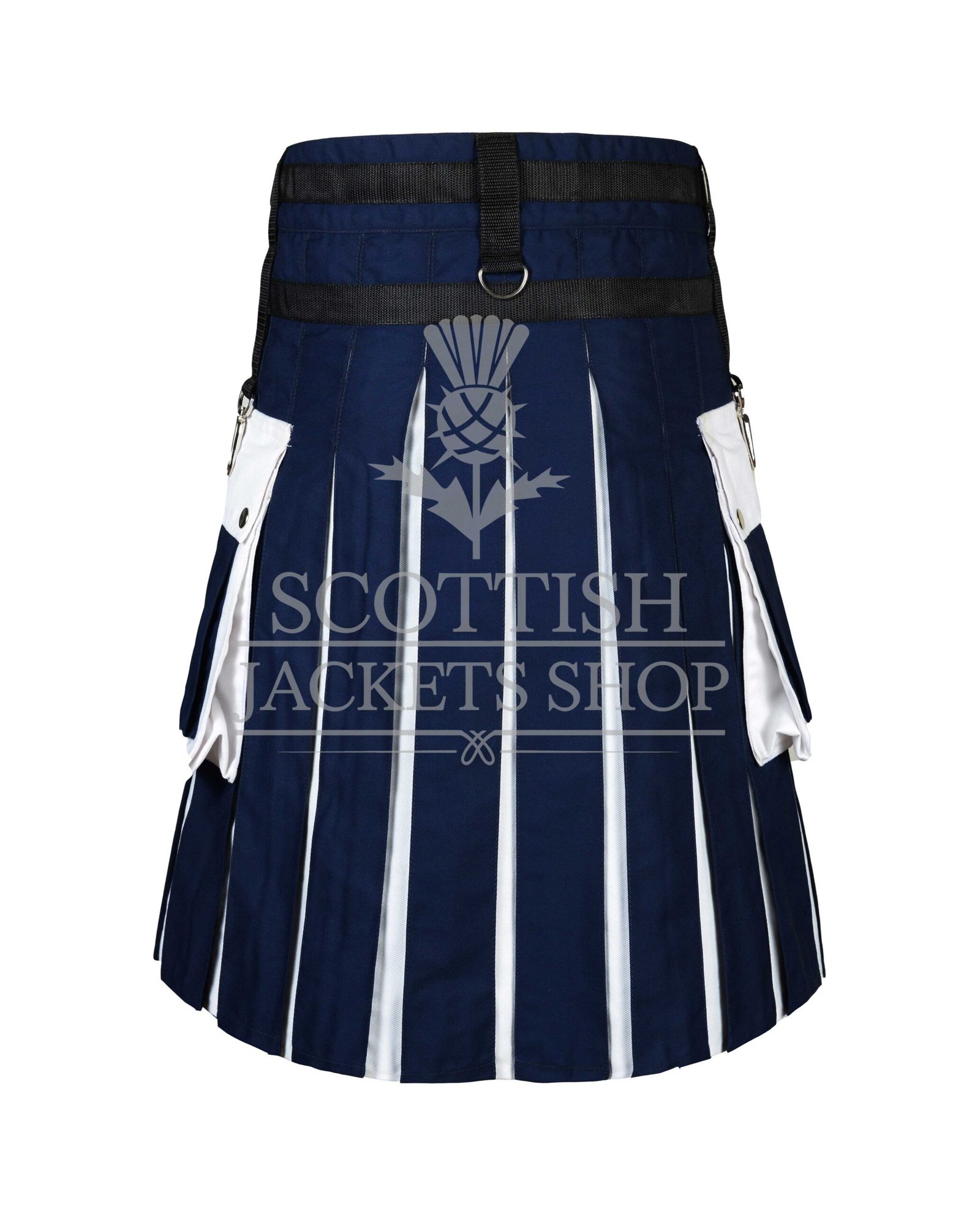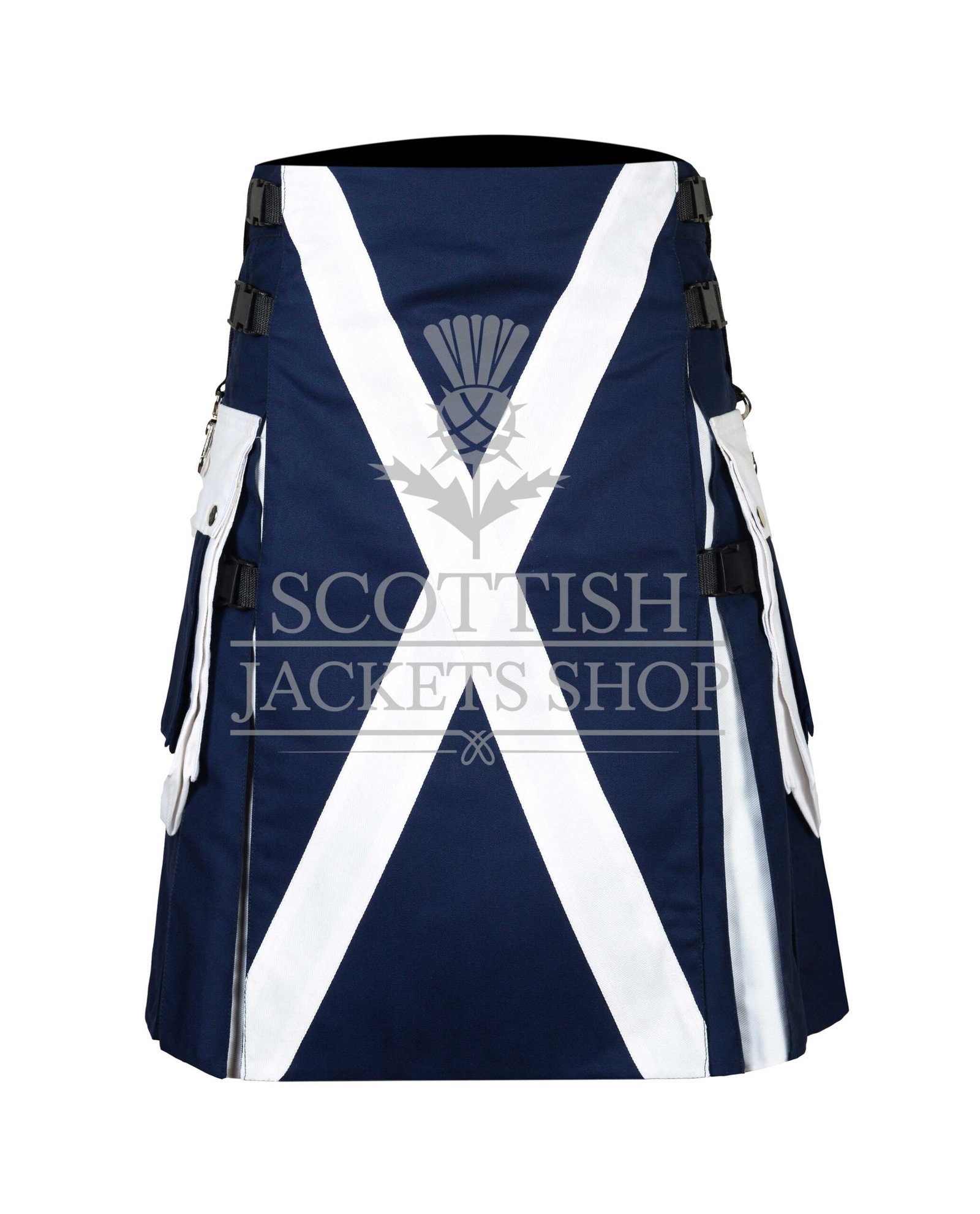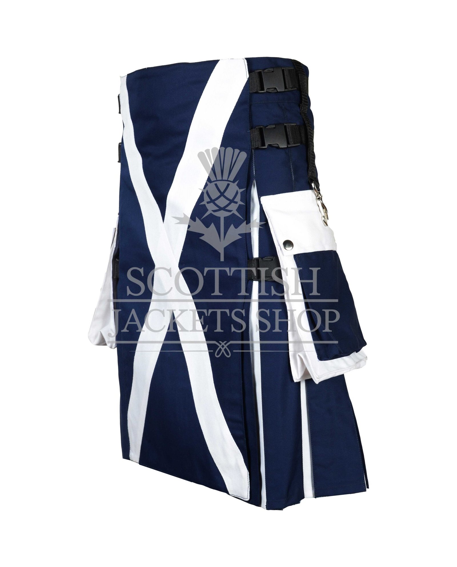 Celebrate your Scottish heritage in bold style with the Scottish Scotland Utility Flag Kilt, a perfect blend of national pride and modern design. This striking kilt showcases the iconic blue and white Saltire flag of Scotland, symbolizing strength, freedom, and tradition.