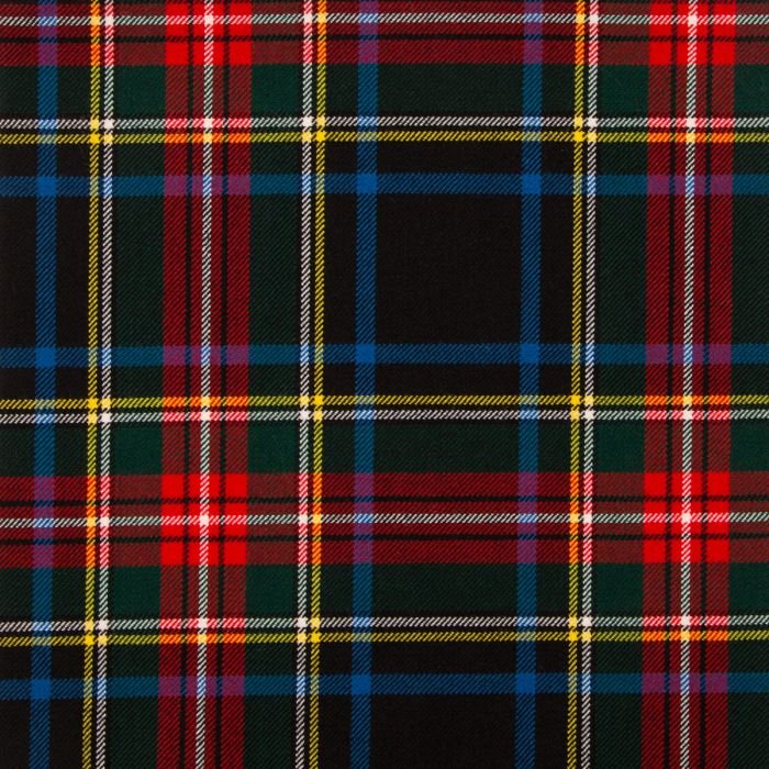The Stewart Black Modern Tartan fabric is a bold and sophisticated take on a classic Scottish design. Featuring deep blacks accented by vibrant red, royal blue, green, and white stripes, this modern tartan delivers striking contrast and contemporary flair while staying true to its Highland roots. Perfect for those connected to Clan Stewart or anyone seeking a standout tartan, it’s crafted from high-quality wool or poly-viscose blends (depending on availability), ensuring both comfort and durability. Whether you’re tailoring a traditional kilt, creating stylish skirts, jackets, or accessories, or designing home décor items like cushions or throws, this fabric offers versatility and lasting appeal. Its crisp pattern and rich colors make it suitable for formal wear, casual fashion, or interior accents. Woven with precision by trusted mills in Scotland, the Stewart Black Modern Tartan fabric brings together heritage and modernity in every thread—ideal for adding a powerful touch of tradition to any creation.