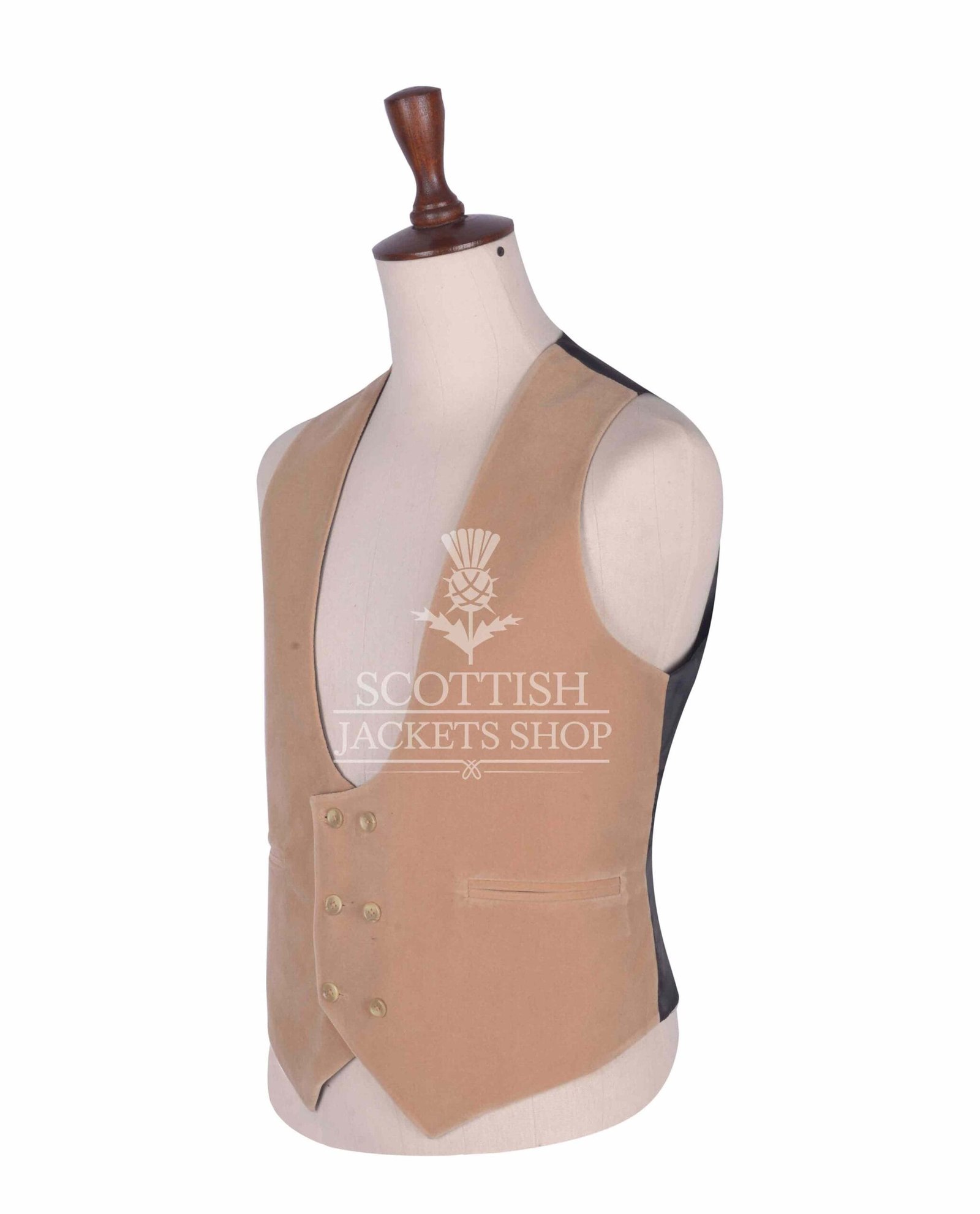 The double-breasted design creates a sharp, structured appearance, flattering your figure. The rich tan velvet adds depth to your outfit, and its subtle sheen catches the light with every movement. With traditional kilt detailing, including functional front buttons, this waistcoat pairs perfectly with a kilt or tailored trousers for a polished appearance.
