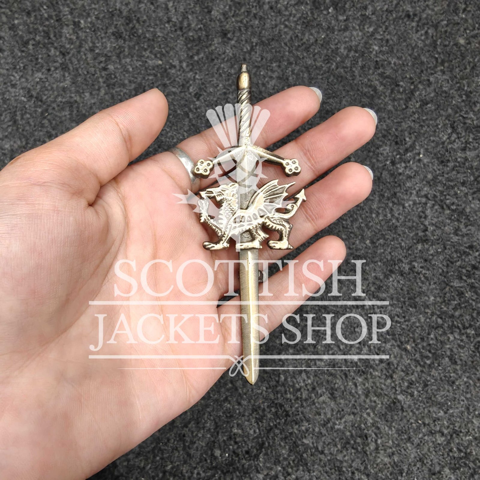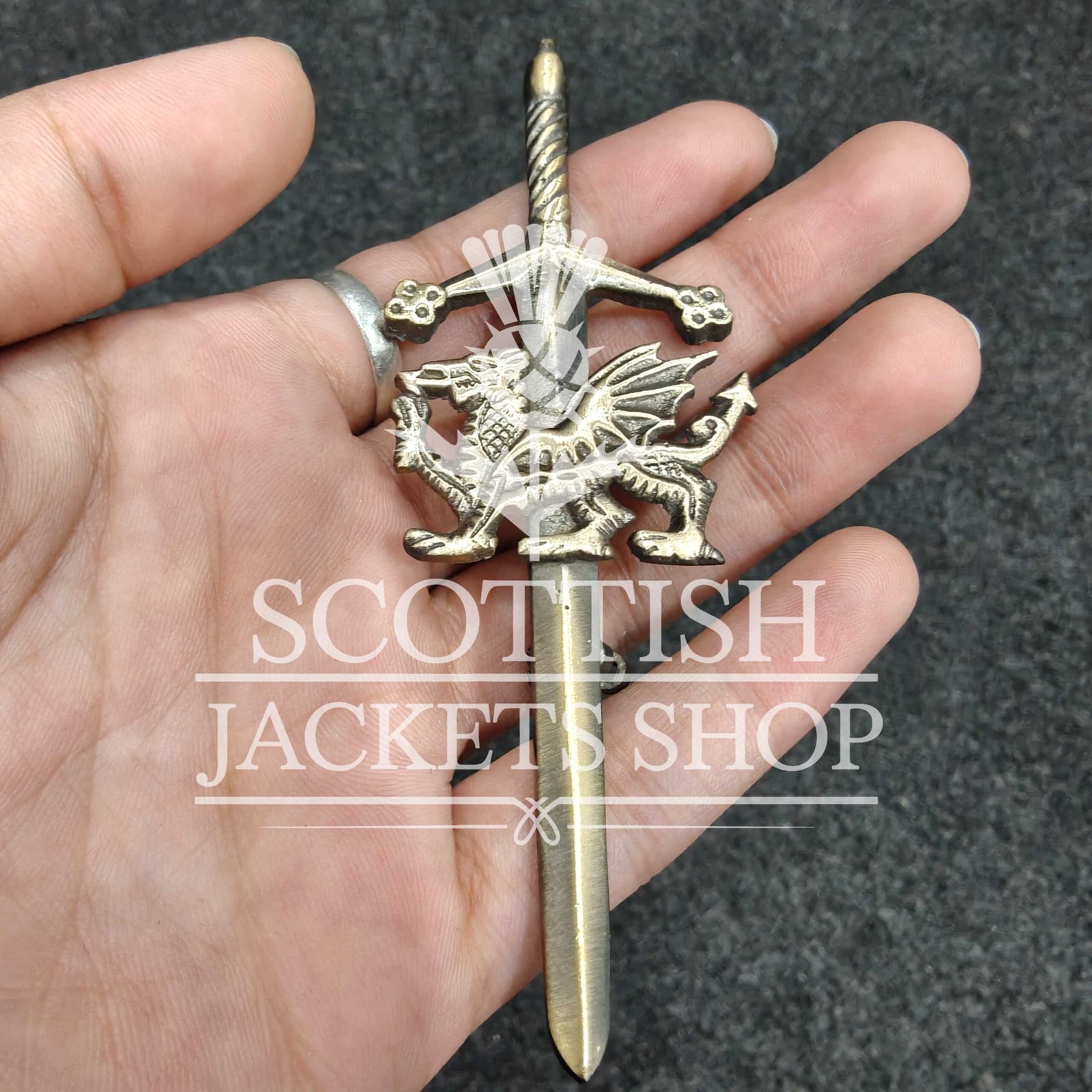 Expertly crafted from high-quality metal alloy, the pin is available in antique pewter, polished silver, or bronze finishes. The dragon is rendered in fine detail—its wings raised, claws extended, and tail curled with energy and pride. It sits atop a sword-style base, combining Celtic symbolism with the traditional look of Highland dress. More than just ornamental, this kilt pin is fully functional.